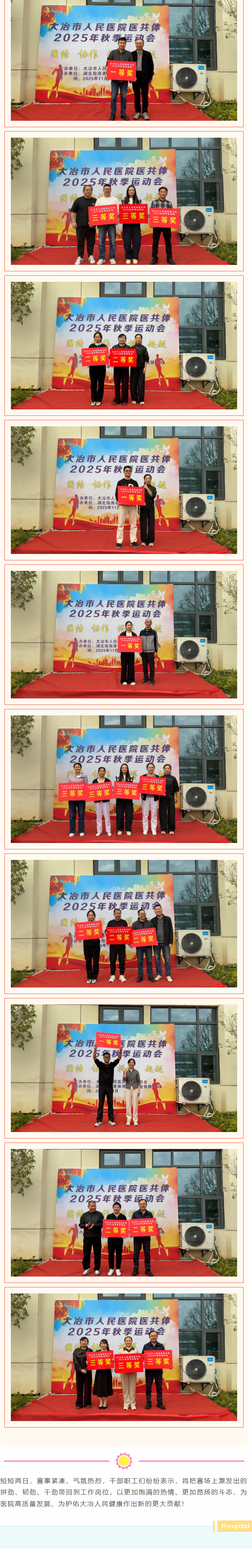 11月11日到12日,大冶市人民医院罗桥院区7号楼广场人声鼎沸、彩旗飘扬,“大冶市人民医院医共体2025年秋季运动会”在这里激情上演。来自医院临床、医技、行政后勤及医共体单位等30个代表队、近500名职工齐聚赛场,用速度与力量、智慧与默契,全面展示新时代医务工作者昂扬向上的精神风貌。