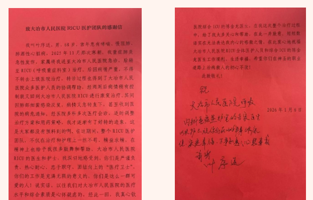 近日,我院呼吸与危重症医学科呼吸重症监护室,大冶唯一一家专科ICU病房。收到了一封患者家属亲笔书写的感谢信。68岁的叶序送老人用质朴的语言,回顾了在“鬼门关”前经历的惊心动魄的时刻,也深情表达了对RICU乐德进主任团队及综合ICU陈金龙主任团队的由衷感谢与高度赞誉。这不仅是一份肯定,更是一份沉甸甸的信任,背后承载着一段关于生命、责任与突破的动人故事。