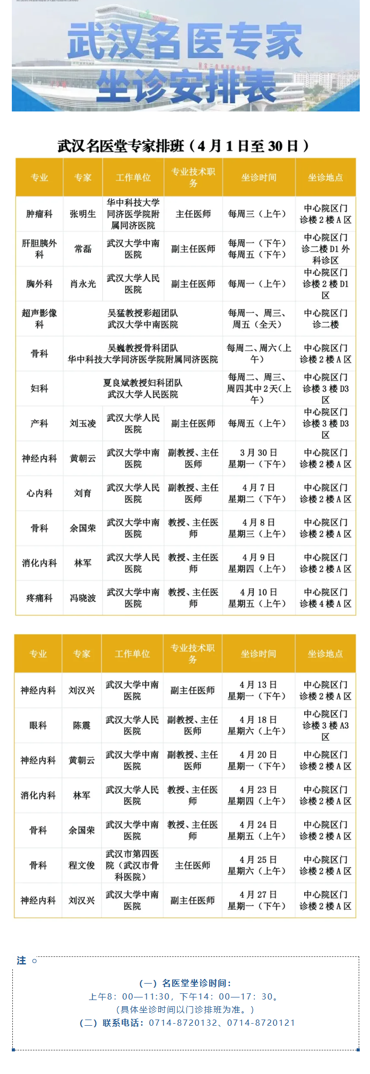 武汉名医堂专家2026年4月坐诊安排表